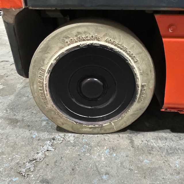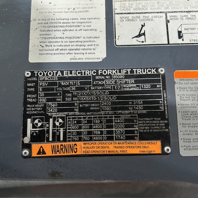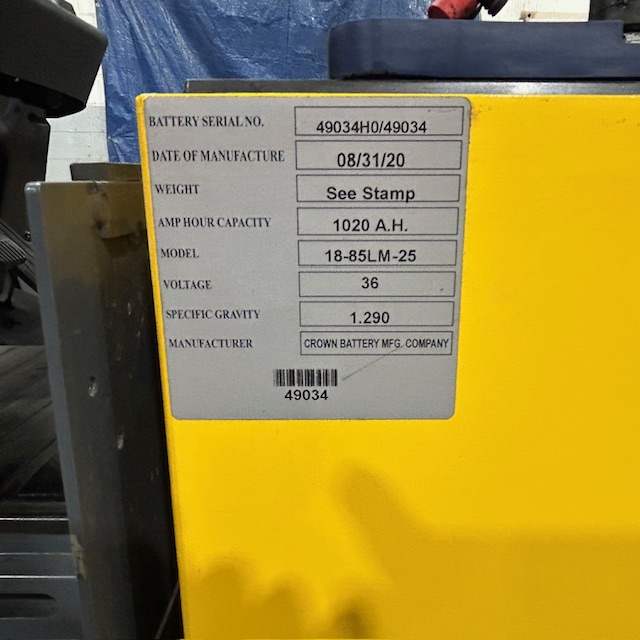 5000lbs Capacity – Triple Mast – 189″ Lift Height – 83″ Lowered Mast Height – Cushion Tires – 36 Volt Electric – Sideshift – 42″ Forks – 9193 Hours