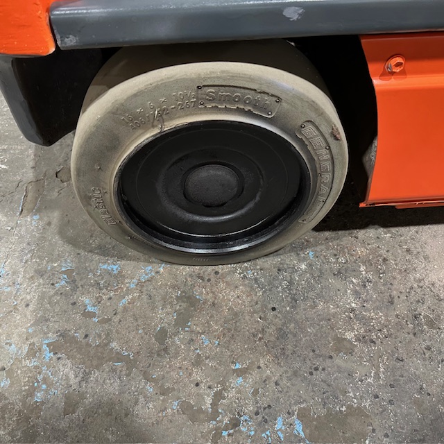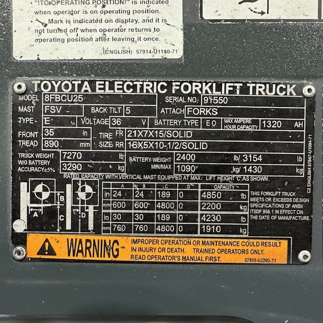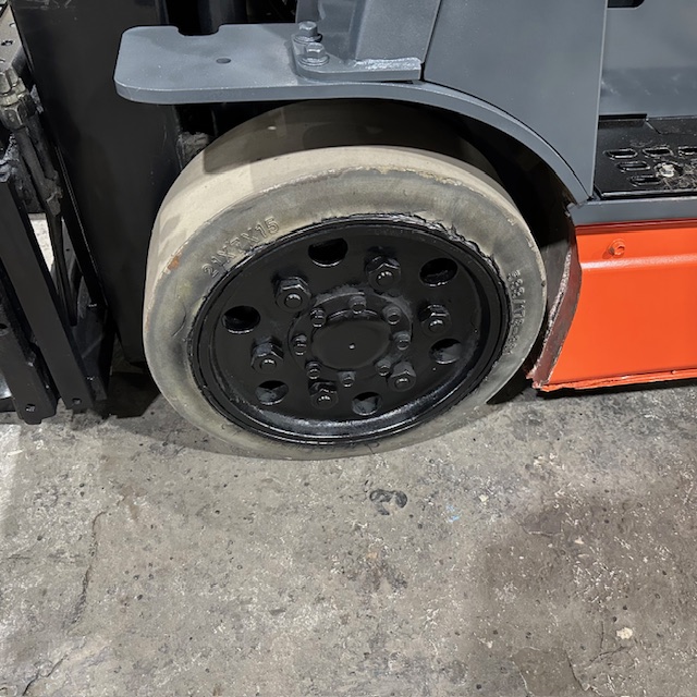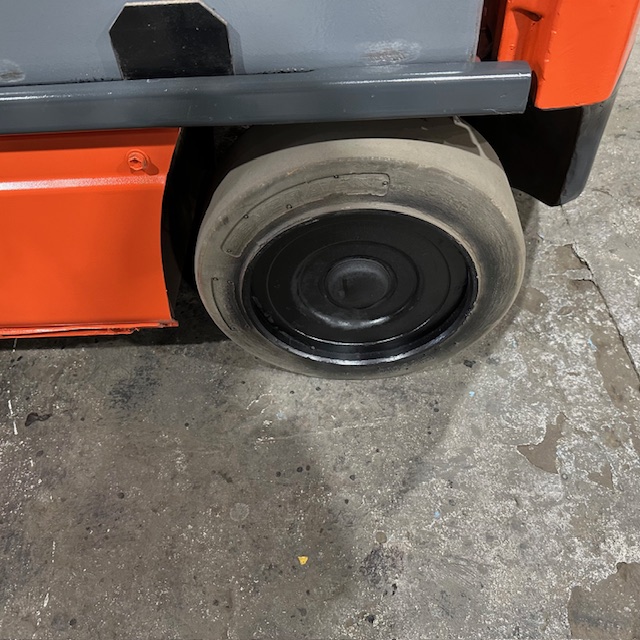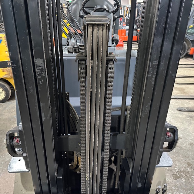 5000lbs Capacity – Three Stage Mast – 189″ Lift Height – 83″ Lowered Mast Height – Cushion Tires – 36 Volt Electric – Sideshift – 42″ Forks – 3056 Hours