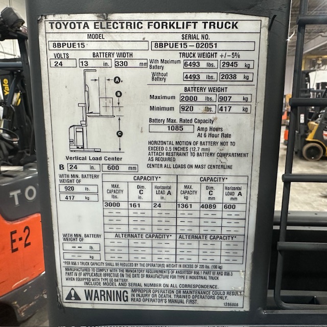 3000lbs Capacity – Two Stage Mast – 161″ Lift Height – 107″ Lowered Mast Height – 24 Volt Electric – 42″ Forks – 4674 Hours